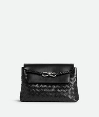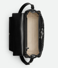 Messenger in Intrecciato leather with signature knot detail featuring an adjustable Product Details - Intrecciato leather small messenger with adjustable and detachable cross-body strap - Two interior flat open pockets and one zipped pocket - Flap closure - Material: calfskin - Lining: Canvas - Color: Black - Hardware: Vintage Silver finish - Height: 20 cm | 7.9” - Width: 29 cm | 11.4” - Depth: 13 cm | 5.1” - Strap drop: 58 cm | 22.8” - Made in: Italy - Product code: 815781V2HLD1208
