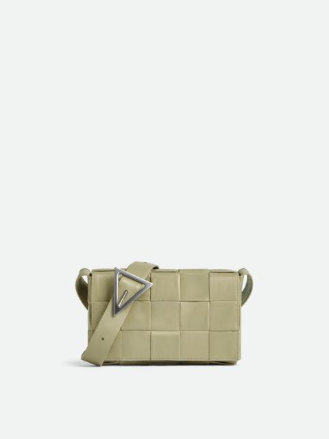 Small Intreccio leather cross-body bag. Product Details - Small Intreccio leather cross-body bag - Single interior zipped pocket - Magnetic closure - Material: Calfskin - Lining: Nylon bonded Intreccio - Color: Travertine - Hardware: Silver finish - Height: 10.5 cm | 4.1" - Width: 17.5 cm | 6.9" - Depth: 3.5 cm | 1.4" - Strap drop: 55 cm | 21.7" - Made in: Italy - Product code: 717587VCQ712919