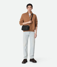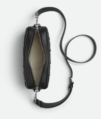 Cross-body bag in grained Intrecciato leather with detachable strap. Product Details - Small Intrecciato grained leather cross-body bag with detachable strap and metal D-ring - One interior flat pocket - Zipper closure - Material: Calfskin - Lining: Canvas - Color: Black - Hardware: Silver finish - Height: 15 cm | 5.9" - Width: 24.5 cm | 9.6" - Depth: 6 cm | 2.4" - Strap drop: 55 cm | 21.7" - Made in: Italy - Product code: 755923V4G318803