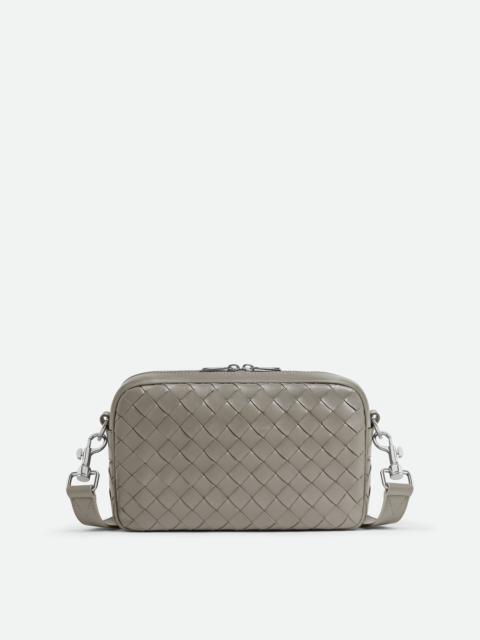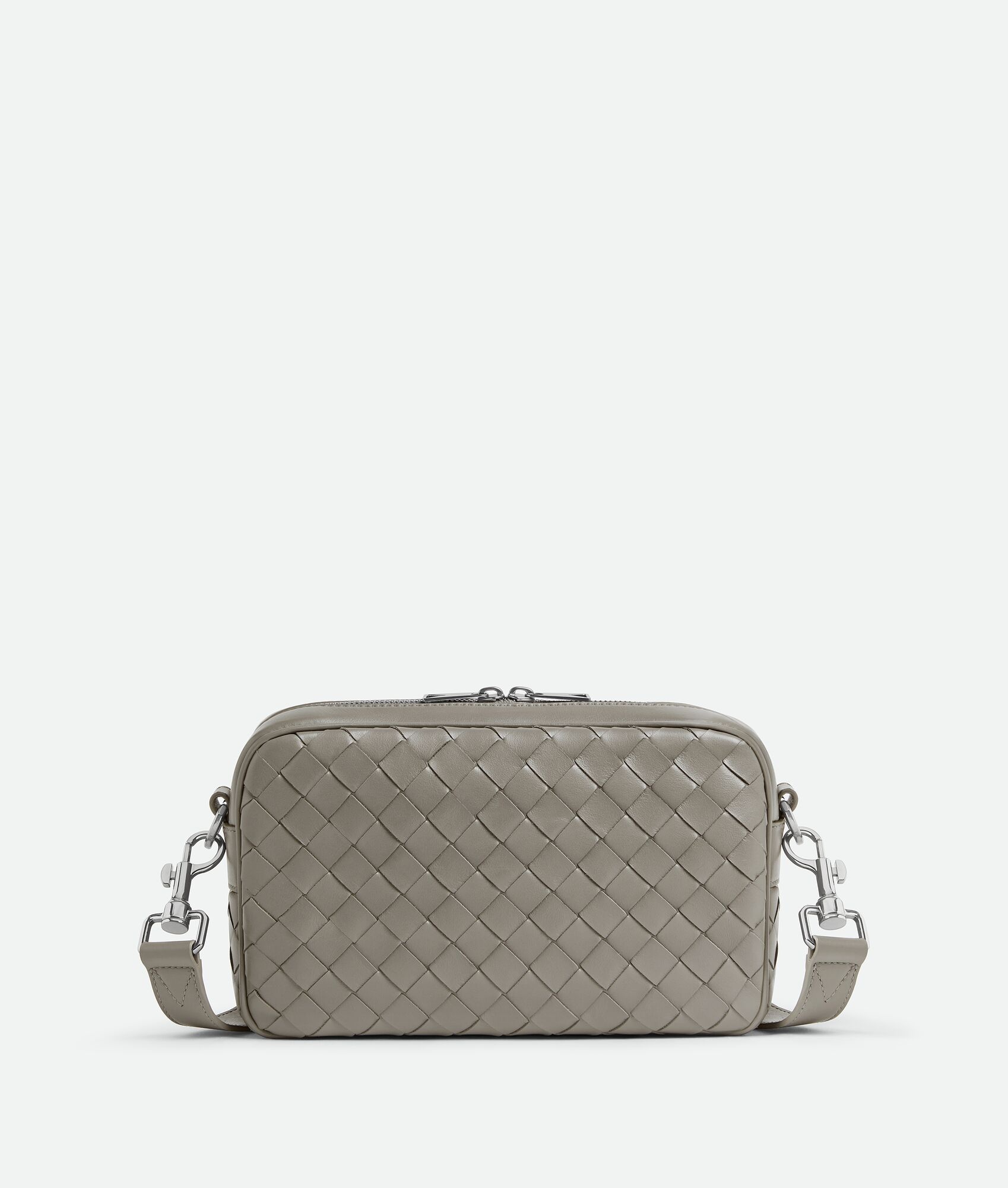 Cross-body bag in Intrecciato leather with detachable strap and metal D-ring. Product Details - Small Intrecciato leather cross-body bag with detachable strap and metal D-ring - One interior flat pocket - Zip closure - Material: Calfskin - Lining: Canvas - Color: Drizzle - Hardware: Silver finish - Height: 15 cm | 5.9" - Width: 24.5 cm | 9.6" - Depth: 6cm - Strap drop: 55cm - Made in: Italy - Product code: 755923V2HL11513