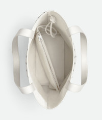 Small Intrecciato leather tote bag. Product Details - Small Intrecciato leather tote bag - Single interior detachable zipped pocket - Material: Calfskin - Lining: Bonded suede - Color: White - Hardware: Silver finish - Height: 39.5 cm | 15.6" - Width: 24 cm | 9.4" - Depth: 15 cm | 5.9" - Handle drop: 27 cm | 10.6" - Made in: Italy - Product code: 729227V2HL19007