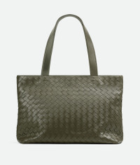 Zipped tote bag in Intrecciato leather. Product Details - Small Intrecciato leather zipped tote bag - Single exterior concealed pocket with magnet closure - One interior zipped pocket, one interior flat open pocket, one metal hook on leather strap - Zip closure - Lining: Canvas - Color: Crocodile - Hardware: Silver finish - Made in: Italy - Product code: 795628V2HL13248 Material - Material: Calfskin Size & Fit - Height: 28.5 cm (11.2") - Width: 43 cm (16.9") - Depth: 15.5 cm (6.1") - Handle drop: 26.5 cm (10.4") - Fits a 13" laptop