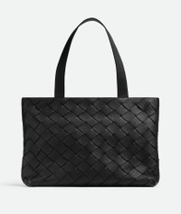 Zipped tote bag in grained Intrecciato leather. Product Details - Small grained Intrecciato leather zipped tote bag - Single exterior concealed pocket with magnet closure - One interior zipped pocket, one interior flat open pocket, one metal hook on leather strap - Zip closure - Lining: Canvas - Color: Black - Hardware: Silver finish - Made in: Italy - Product code: 795628V4G318803 Material - Material: Calfskin Size & Fit - Height: 26 cm (10.2") - Width: 37 cm (14.6") - Depth: 13 cm (5.1") - Strap drop: 42 cm (16.5") - Fits a 13" laptop