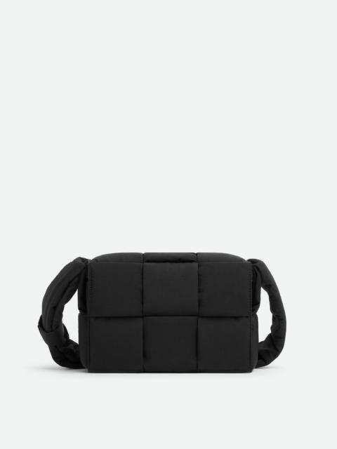 Cross-body bag made from lightweight padded nylon using Intreccio craftsmanship. Product Details - Small padded Intreccio nylon cross-body bag - Single interior zip pocket - Magnetic closure - Material: Polyamide - Unlined - Color: Mud - Hardware: Silver finish - Height: 14 cm | 5.5" - Width: 23 cm | 9.1" - Depth: 7.5 cm | 3" - Strap drop: 50 cm | 20" - Made in: Italy - Product code: 755182VBO812877