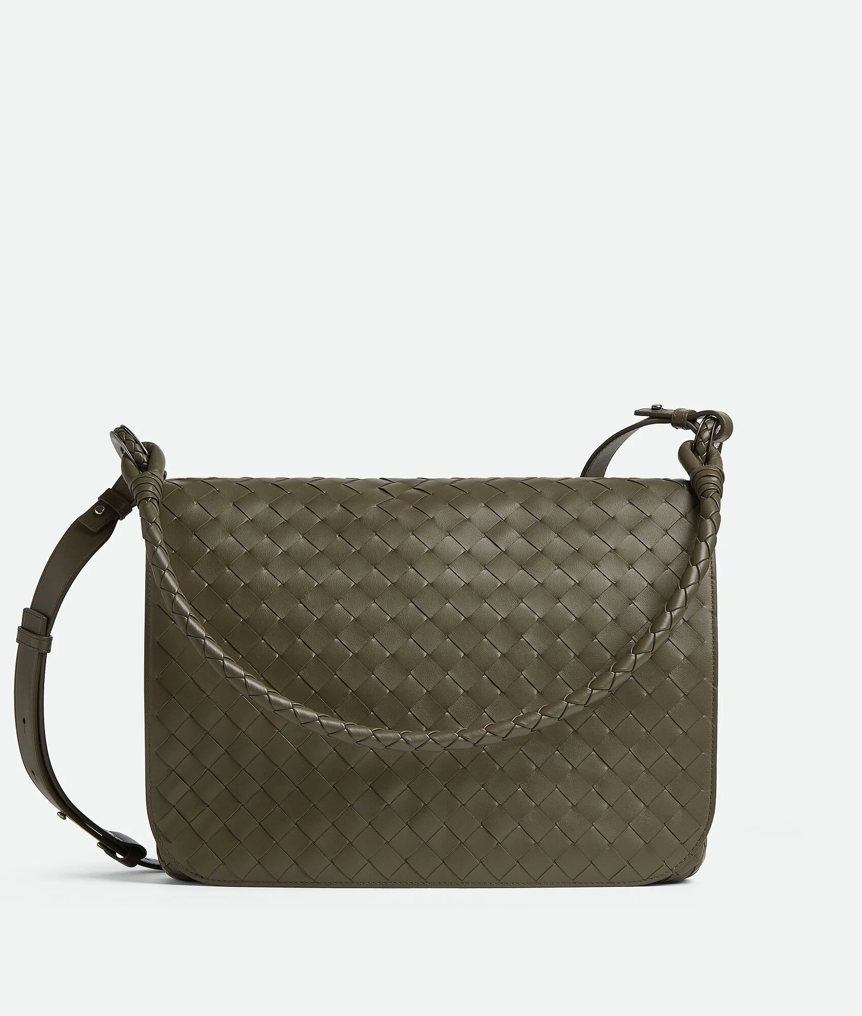 Messenger bag in Intrecciato leather with double strap. Product Details - Intrecciato leather messenger with one adjustable and detachable cross-body strap and one coaxial shoulder strap - Single interior zipped pocket, double flat phone pocket and key hook on a strap - Flap closure secured by magnets - Lining: Canvas - Color: Cypress - Hardware: Silver finish - Height: 26 cm | 10.2" - Width: 35 cm | 13.8" - Depth: 7.5 cm | 3" - Handle drop: 25 cm | 9.8" - Strap drop: 50 cm | 19.7" - Made in: Italy - Product code: 795074V2HL13238
