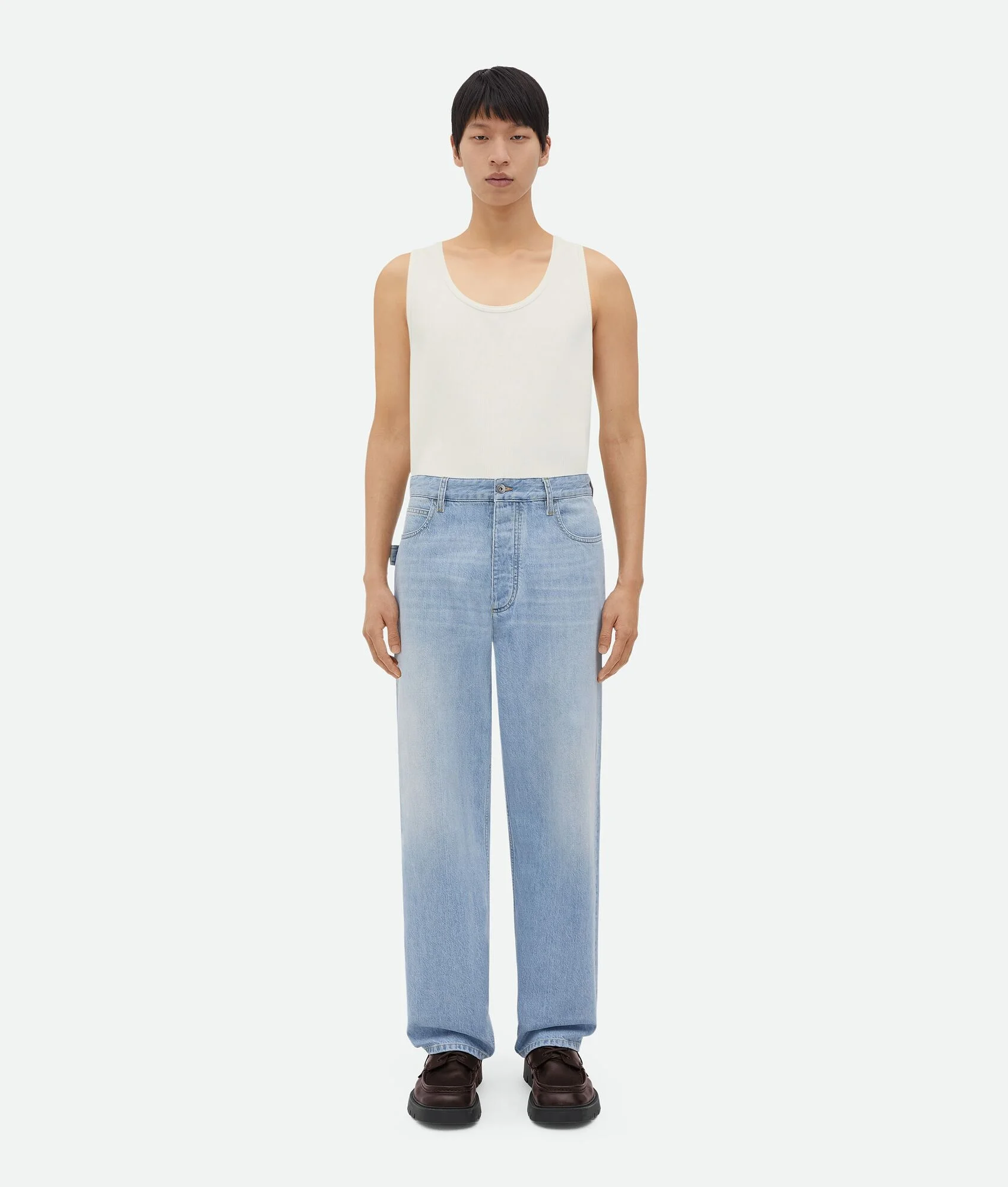 Light-bleached denim. Product Details - Light-bleached denim - Parakeet leather tab - Button closure - Relaxed fit - Material: 100% Cotton - Color: Light Bleach - Made in: Italy - Product code: 740397V2ZC04946 Size & Fit - Model is 186 cm | 6'1" and is wearing a Bottega Veneta size 46