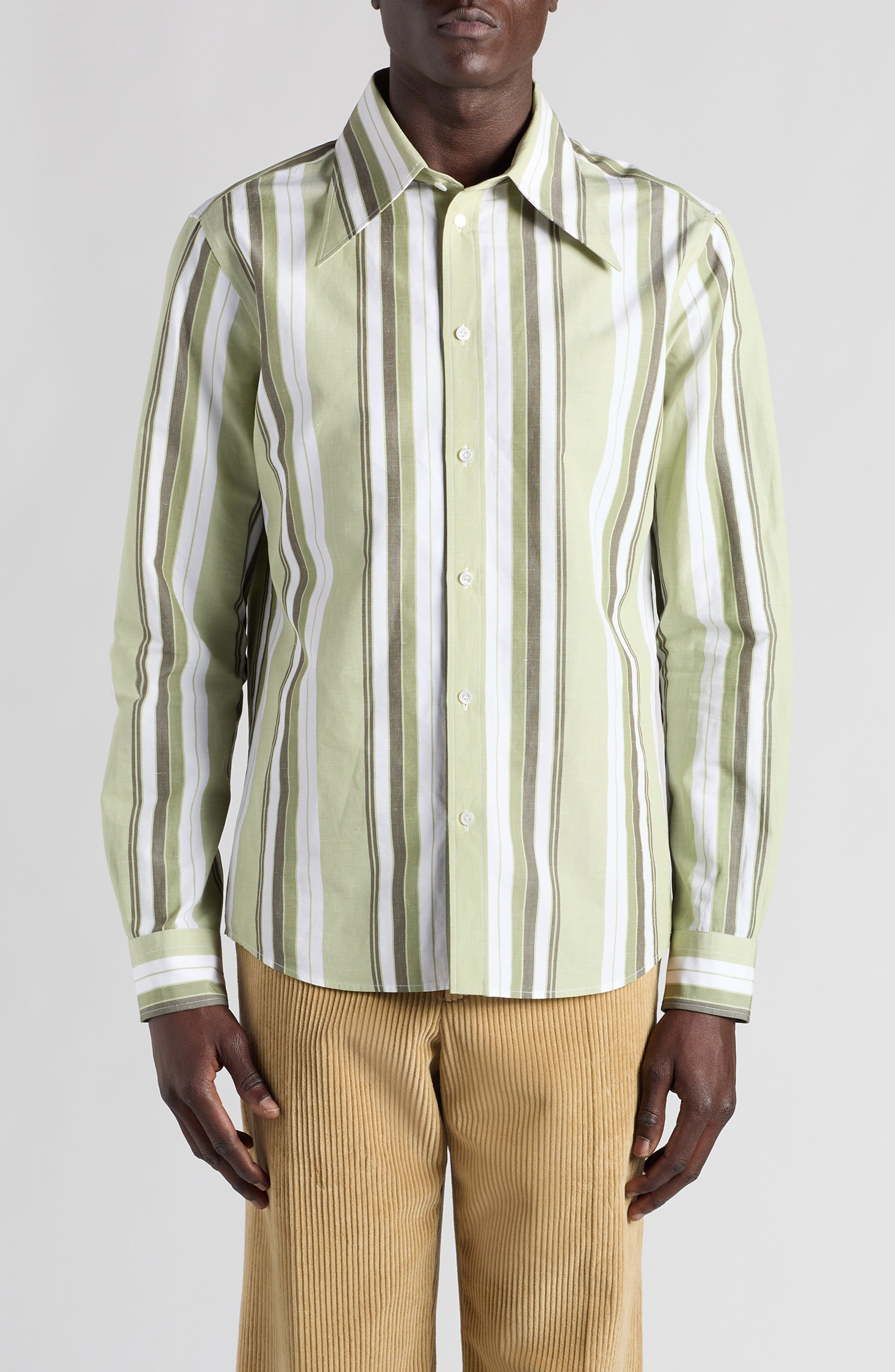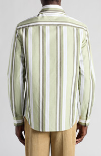 Shirt in chunky striped cotton. Product Details - Chunky striped cotton shirt - "BV" embroidery detail - Button closure - Regular fit - Material: 69% Cotton, 31% Linen - Color: Pale Green/White - Made in: Italy - Product code: 793027V4D103184 Size & Fit - Model is 189 cm|6'2" and is wearing a Bottega Veneta size 46
