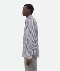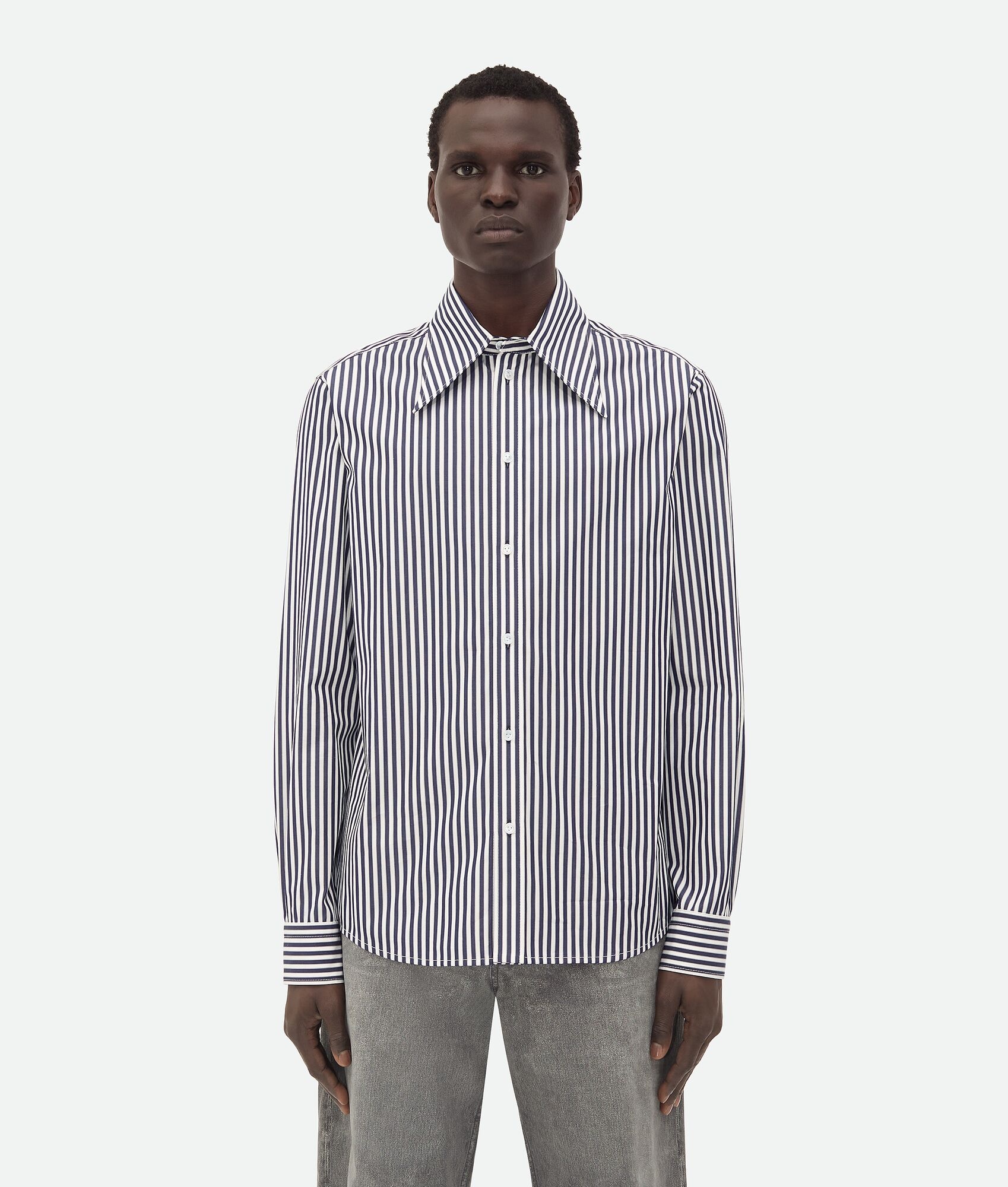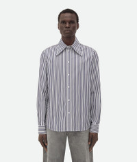 Shirt with sharp collar in narrowly striped poplin. Product Details - Striped poplin shirt - Sharp collar detail - "BV" embroidery detail - Button closure - Regular fit - Material: 100% Cotton - Color: Blue/White - Made in: Italy - Product code: 793027V4D404028 Size & Fit - Model is 189 cm|6'2" and is wearing a Bottega Veneta size 46