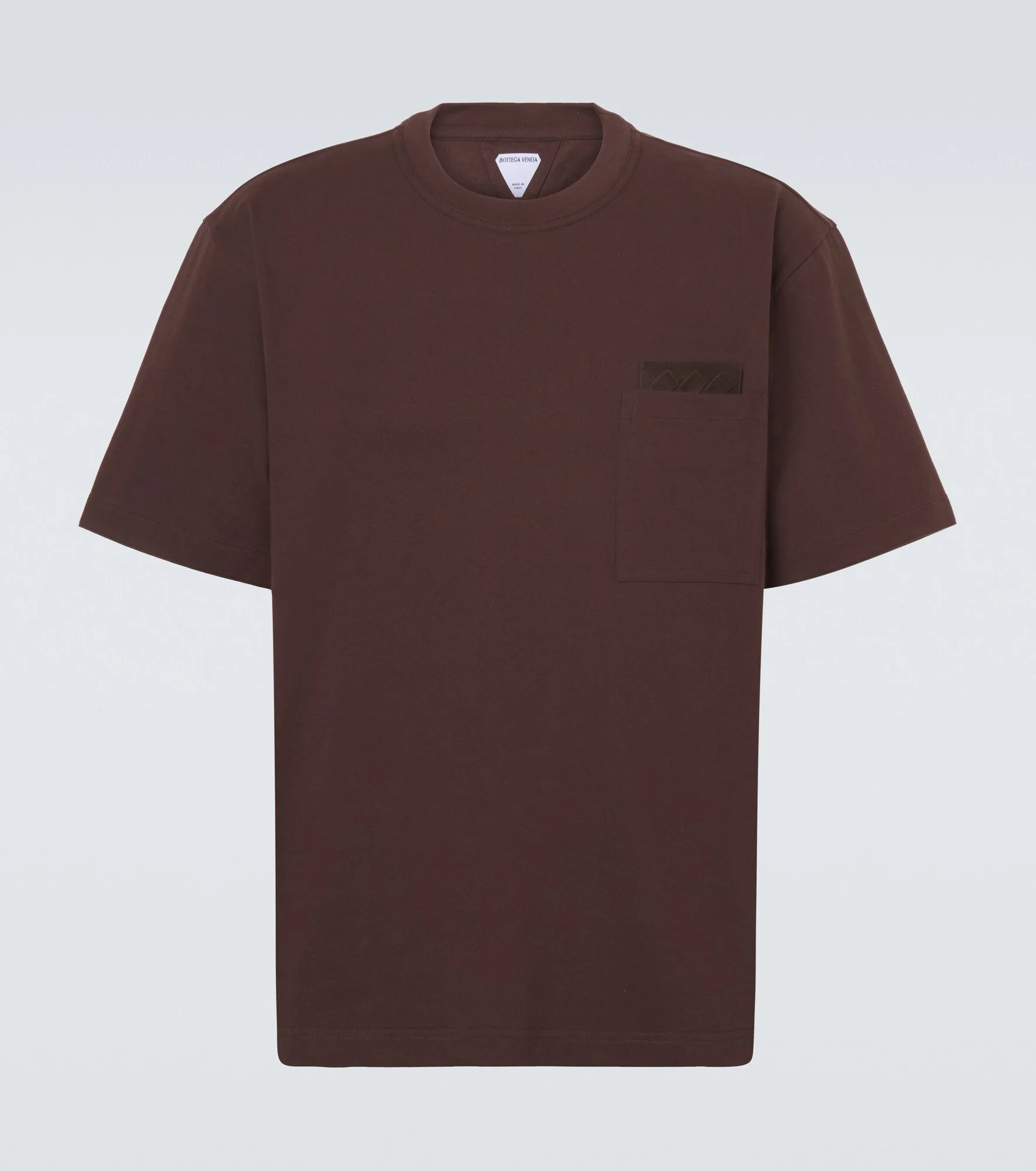Elevate your essentials edit with this T-shirt from Bottega Veneta. The piece is crafted in Italy from soft cotton jersey and detailed with a signature Intrecciato suede patch at the chest. Product Details - Material: 100% cotton - Care instructions: hand wash - Made in Italy - Color: brown - Designer color name: Dark Carrubo - Trim: 97% cotton, 3% elastane - Embroidery: 100% polyester - Details: 100% leather - Collar: crewneck - Pockets: chest patch pocket - Contains non-textile parts of animal origin - Item number: P01151069 Size & Fit - True to size - Dropped shoulders - Designed for a loose fit - Slightly stretchy fabric - Falls to the hip - Height of model is %cm%cm-%inch%" and wears a size L