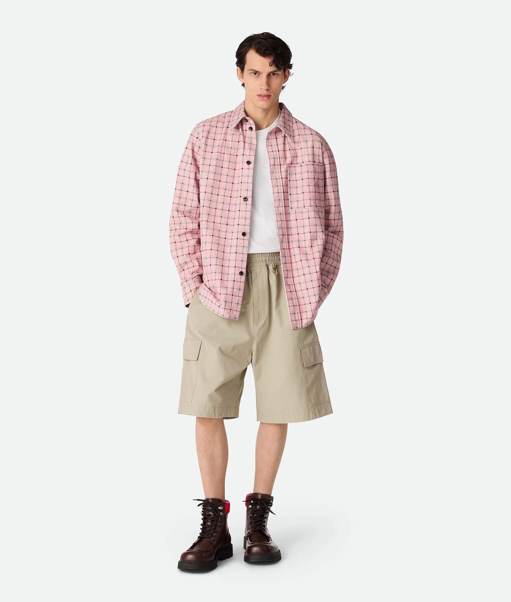 Cargo shorts in matte technical cotton faille. Product Details - Matte technical cotton faille cargo shorts - Cargo pockets - Elasticated waistband - Material: 61% Polyamide, 36% cotton, 3% polyurethane - Color: Sahara - Made in: Italy - Product code: 826462V4Y502549 Size & Fit - Model is 186 cm | 6'1" and is wearing a Bottega Veneta size S