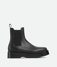 Chelsea ankle boot in smooth calfskin leather featuring a flatform outsole and an Product Details - Leather Chelsea ankle boot - Insole with high-frequency Intrecciato pattern - Material: calfskin - Lining: Calfskin - Color: Black - Leather outsole - Flatform: 5 cm | 2” - Made in: Italy - Product code: 810479V4QK01000