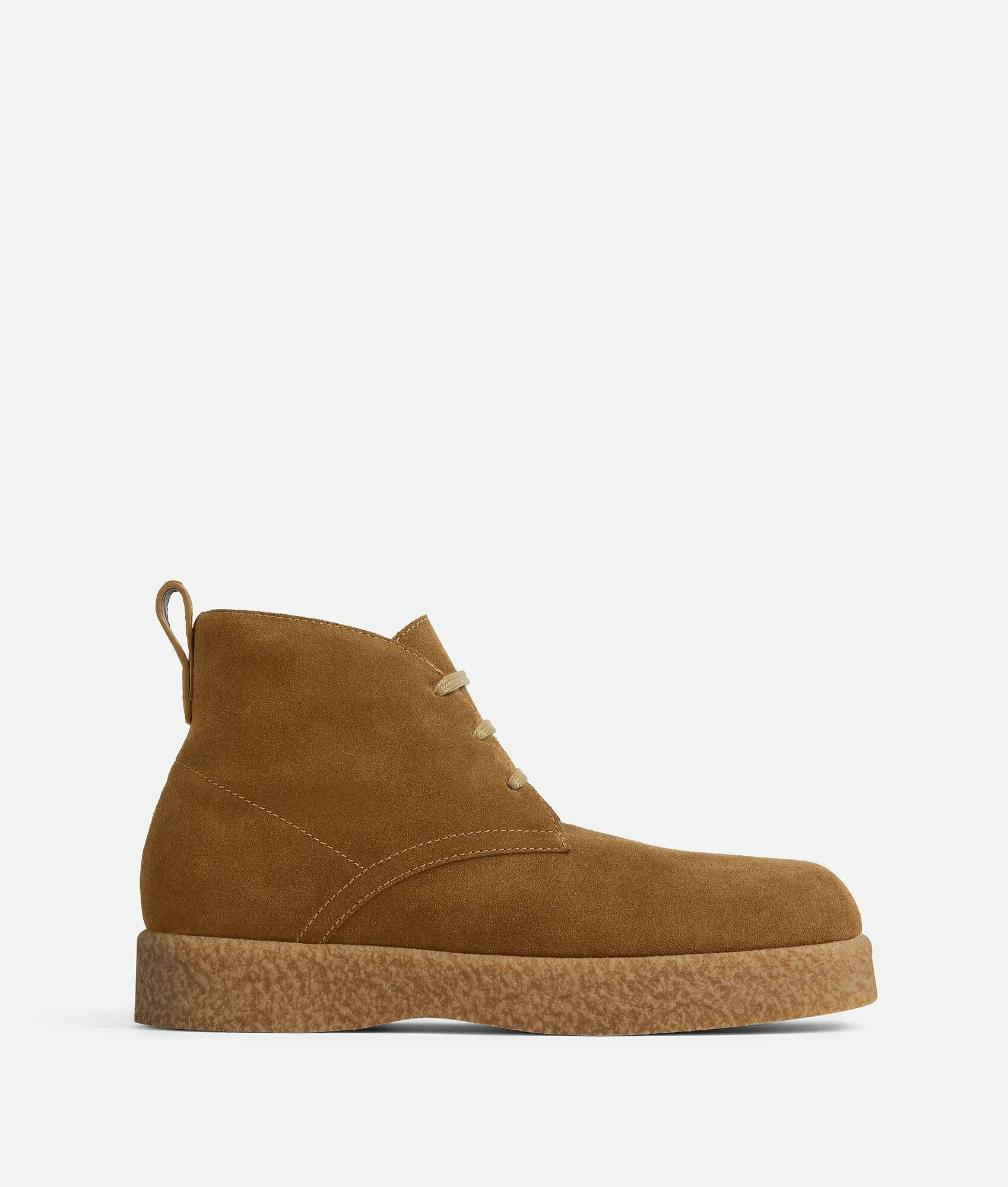 Lace-up ankle boot in rugged suede featuring a flatform crepe effect outsole and Product Details - Rugged suede lace-up ankle boot - Insole with high-frequency Intrecciato pattern - Intrecciato leather backloop - Material: Calfskin - Lining: Lambskin - Color: Cork - Crepe-effect rubber outsole - Flatform: 4 cm | 1.8” - Made in: Italy - Product code: 806443V4QN02615