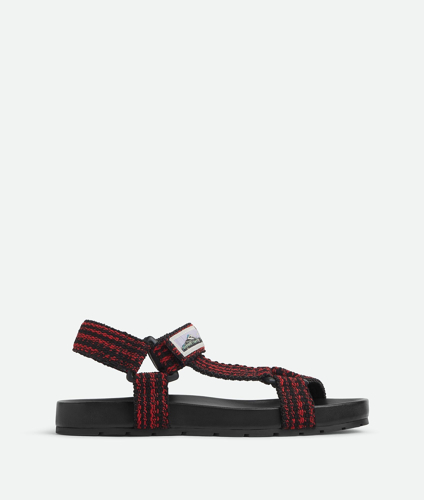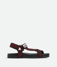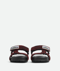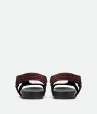 Slingback sandal in ribbon fabric with ergonomic insole. Product Details - Two-tone ribbon fabric slingback sandal - Ergonomic insole - Special label on the velcro closure - Material: 57% Cotton, 22% Polyester, 12% Viscose, 6% Wool, 3% Other fibers - Lining: Coated fabric - Color: Black/Carmine - Rubber outsole - Made in: Italy - Product code: 799756V4F001162