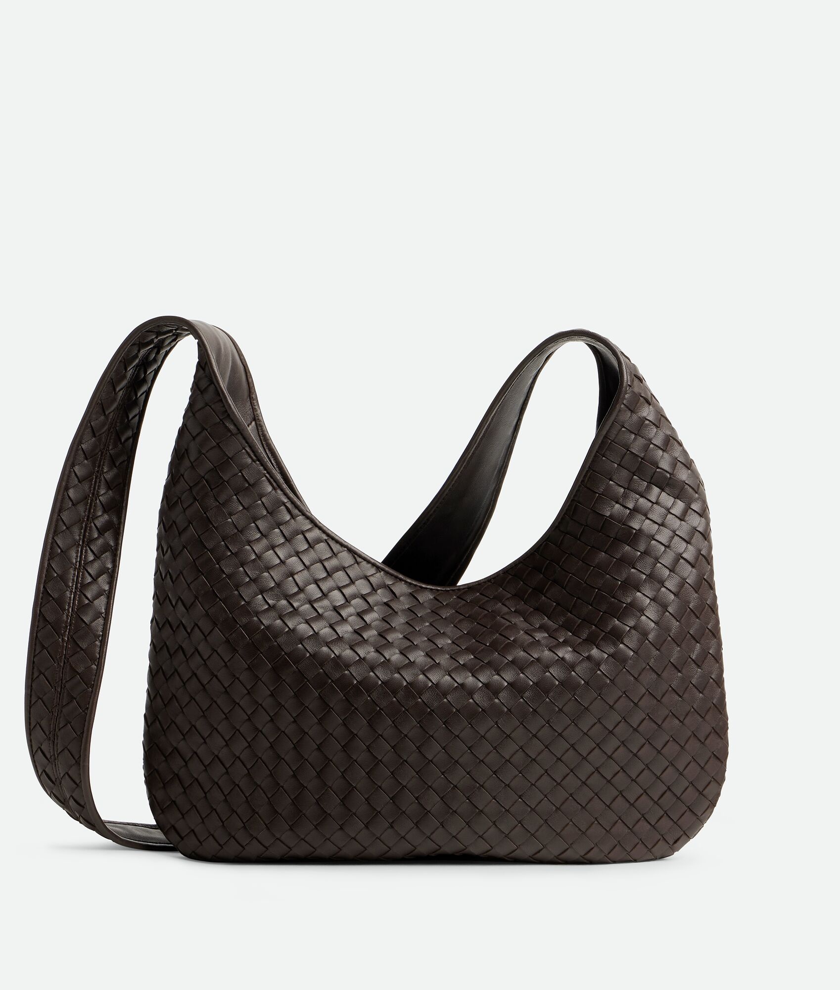 Cross-body bag with rounded shape in Intrecciato nappa fluffy. Product Details - Intrecciato nappa fluffy cross-body bag - One interior zippered pocket - Zip closure - Material: Lambskin - Lining: Suede - Color: Fondant - Hardware: Silver finish - Height: 24 cm | 9.5" - Width: 38cm - Depth: 2 cm | 0.8" - Strap drop: 50 cm | 19.7” - Made in: Italy - Product code: 826877V5KD02145