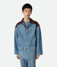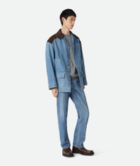 Jacket in vintage indigo washed denim with Intrecciato leather detail. Product Details - Vintage indigo washed denim jacket - Intrecciato leather detail - Button closure - Relaxed fit - Color: Mid Blue - Made in: Italy - Product code: 837940V42W04715 Size & Fit - Model is 188 cm|6'2" and is wearing a Bottega Veneta size 46