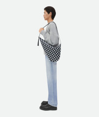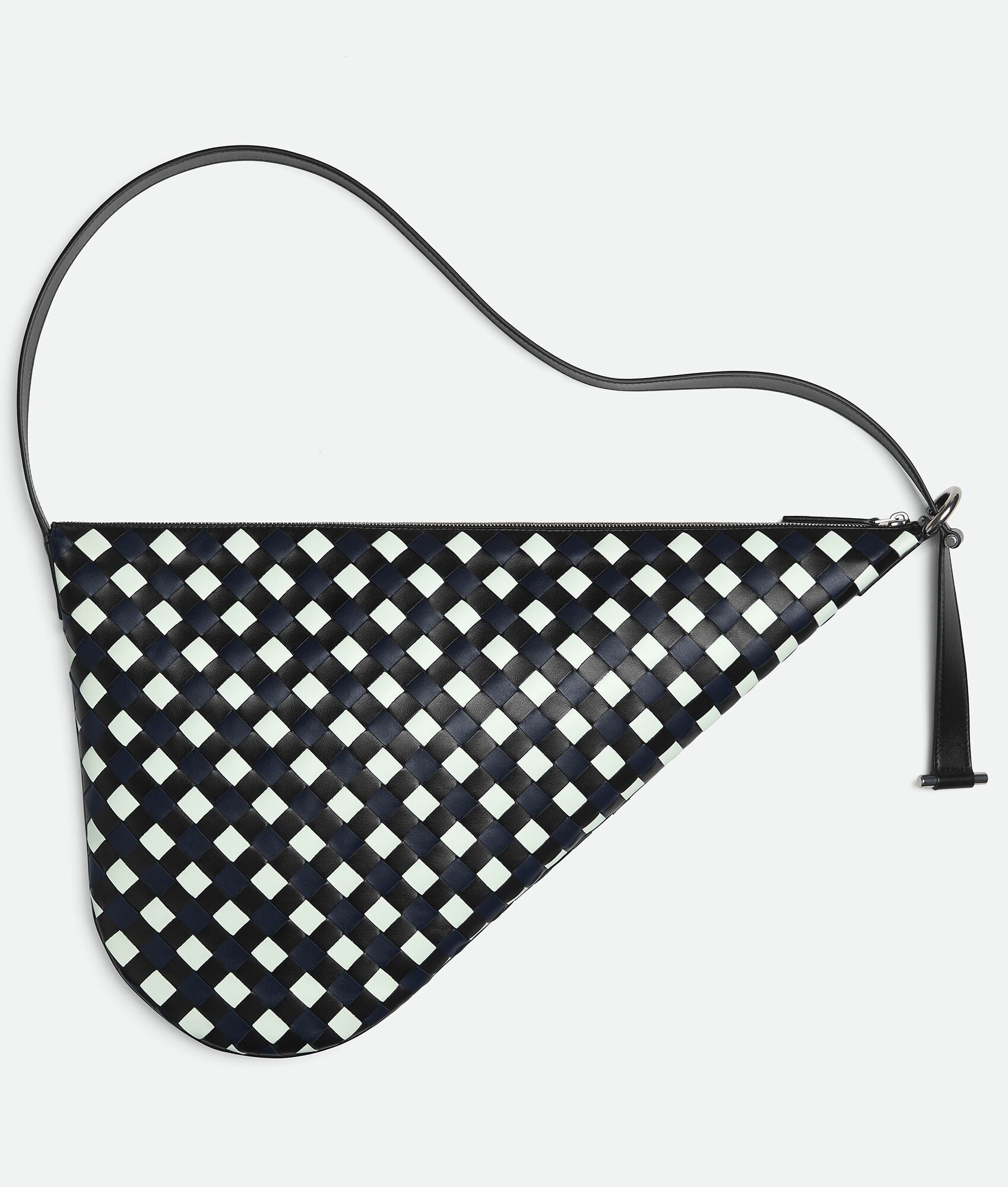 Cross/body bag meticulously realised with Intrecciato craftsmanship in tricolour Product Details - Intrecciato check tricolor leather cross/body bag - Leather sliding strap adjustable with metal ring and T/bar - Single interior zippered pocket - Zipper closure - Material: Calfskin - Lining: Suede - Color: Black/Space/Glacier - Hardware: Silver finish - Height: 33 cm | 13" - Width: 52 cm | 20.5" - Depth: 2 cm | 0.8" - Strap drop: 40 cm | 15.7" - Made in: Italy - Product code: 778251V3TS28594