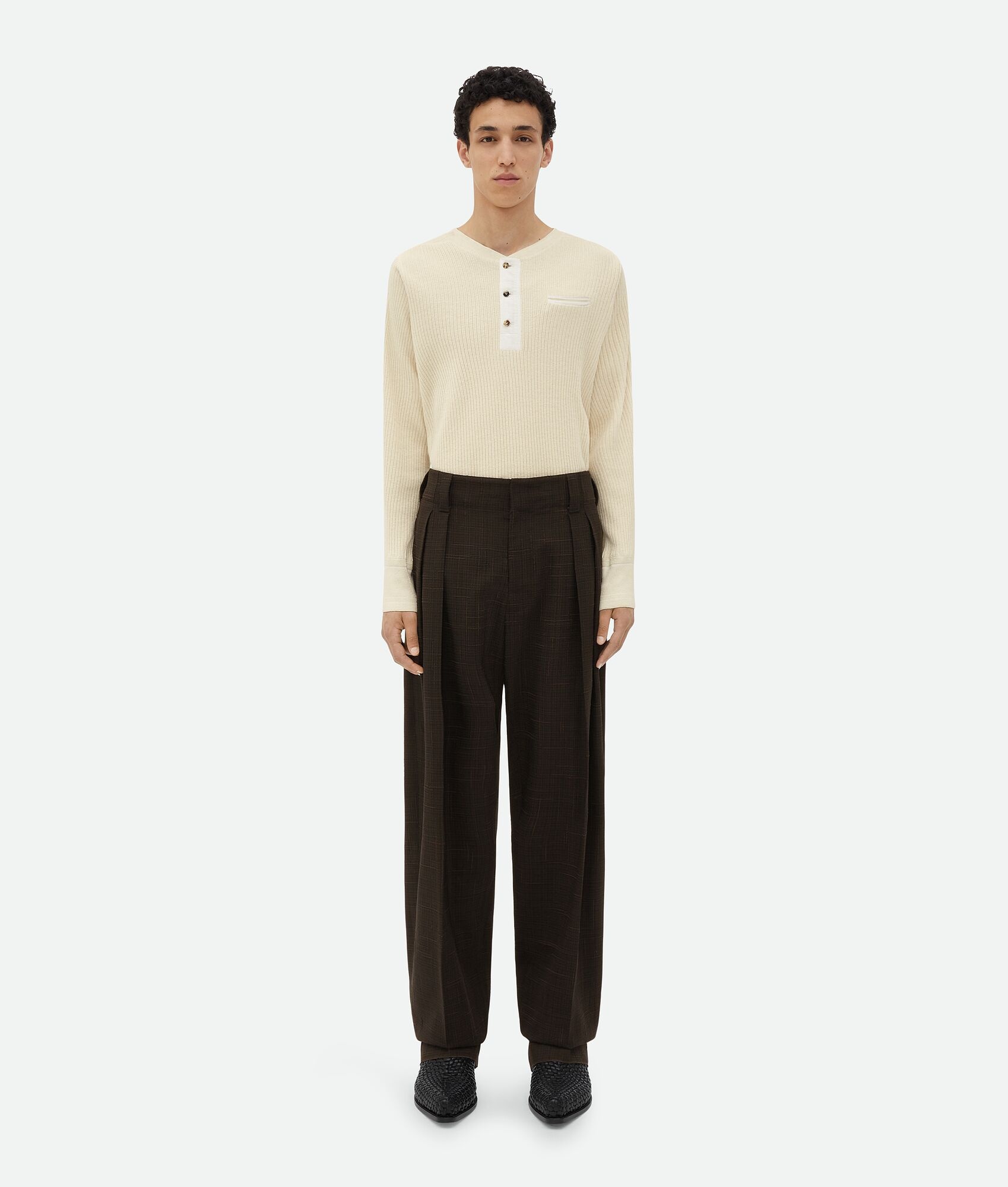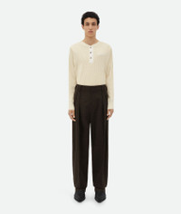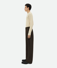 Trousers with fluid pleated silhouette realised in a textured fabric blend developed Product Details - Viscose and silk textured pants - Zipper, button and hook closure - Wide leg - Material: 40% Viscose, 35% Silk, 25% Polyester - Color: Fondant/Black Melange - Made in: Italy - Product code: 759372V3FD02078 Size & Fit - Model is 187 cm|6'1" and is wearing a Bottega Veneta size 46