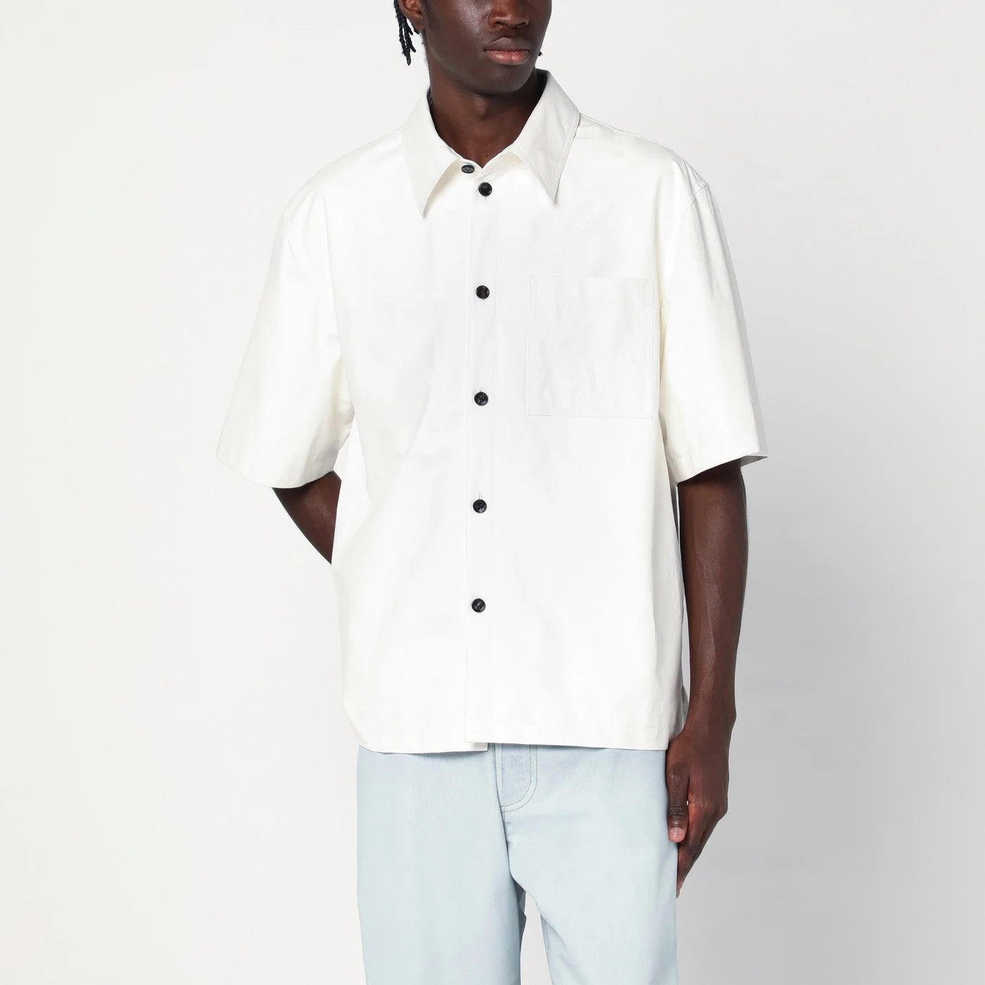 Short sleeved shirt by Bottega Veneta in papery textured lightweight nappa leather feauturing classic collar button closure chest pocket abd regular fit.
