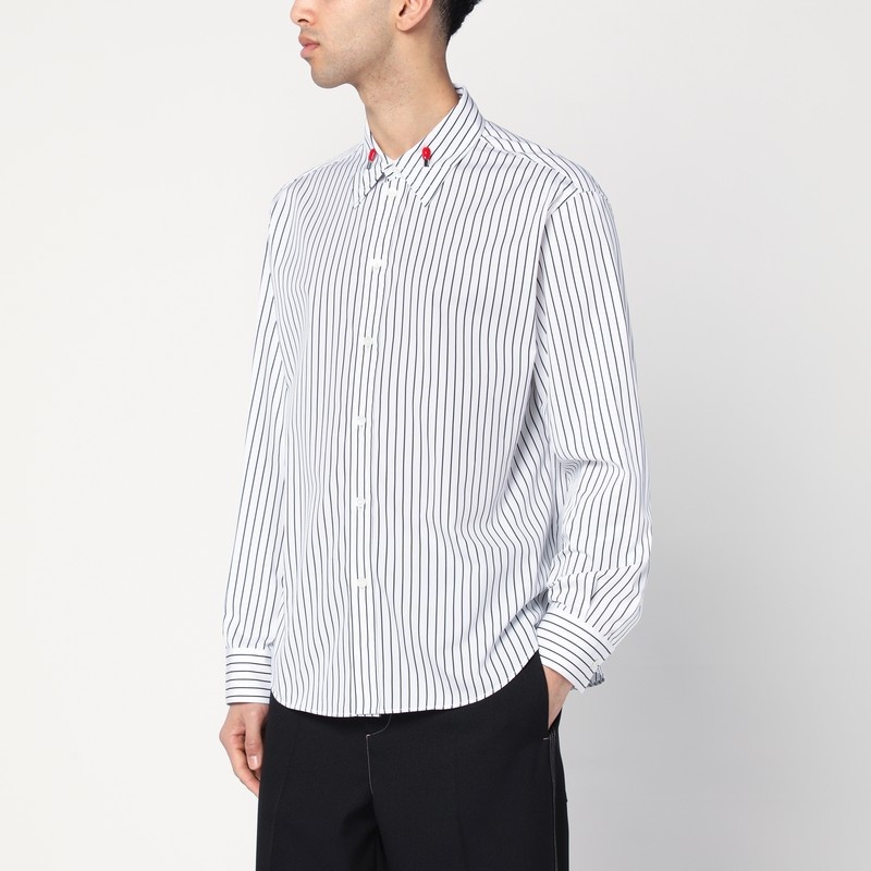 Bottega Veneta white cotton shirt with black stripes, featuring a front button closure, long sleeves with buttoned cuffs, a curved hem, and a collar with enamel matchstick-shaped details.