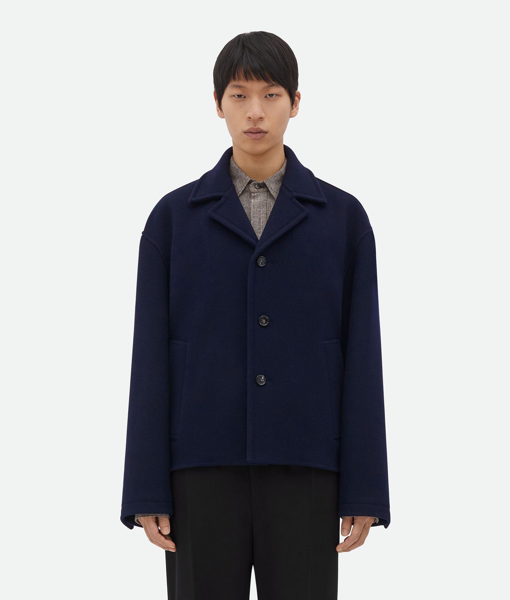 Wool and cashmere jacket. Product details • Wool and cashmere jacket • Button closure • Double construction • Half lined • Regular fit Material: 79% Wool, 21% Cashmere • Color: Navy Made in: Italy Size & fit • Model is 186 cm|6'1" and is wearing a Bottega Veneta size 46