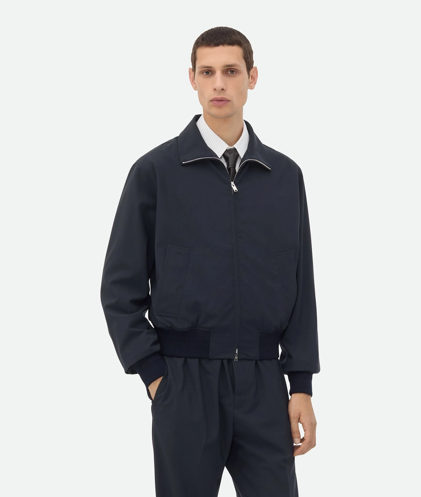 Blouson in fine wool. Product Details - Fine wool blouson - Ribbed cuffs and hem - Special label on the interior - Zipper closure - Lined - Material: 100% wool - Color: Midnight Blue - Made in: Italy - Product code: 811382V4XP04246 Size & Fit - Model is 188 cm|6'2" and is wearing a Bottega Veneta size 46