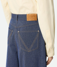 Trousers with wide leg in melange wool cotton drill featuring an indigo denim effect. Product Details - Melange wool cotton drill trousers - Wide leg - Indigo denim effect - Button closure - Material: 63% Wool, 37% cotton - Color: Indigo - Made in: Italy - Product code: 825520V5CN04245 Size & Fit - Model is 187 cm|6'2" and is wearing a Bottega Veneta size 46