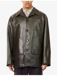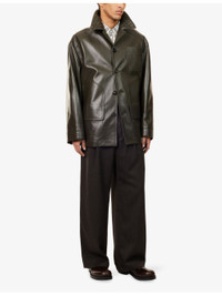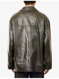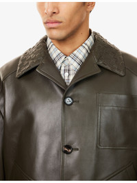 PRODUCT DETAILS - Bottega Veneta leather jacket - 100% leather - Exposed button fastening at front - Woven notched collar, long sleeves, buttoned cuffs, three patch pockets at front, straight hem, lined - Specialist leather clean - Made in Italy - Size UK 50: length 33.4in / 85cm, chest 48in / 122cm - Model is 6ft 2in/1.88m and wears a size UK 50 - Midweight, non-stretch Ref: R04539282