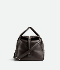 Weekender in Intrecciato leather with adjustable and detachable strap. Product Details - Intrecciato leather weekender with adjustable and detachable strap - Spacious interior with foldable gusset - One interior zipped pocket and two flat open pockets - One external zipped pocket - Zip closure - Material: calfskin - Lining: Canvas - Color: Fondant - Hardware: Silver finish - Height: 28.5 cm | 11.2” - Width: 46 cm | 18.1” - Depth: 29.5 cm | 11.6” - Handle drop: 15 cm | 5.9” - Strap drop: 57 cm | 22.4” - Made in: Italy - Product code: 815814V2HL12145