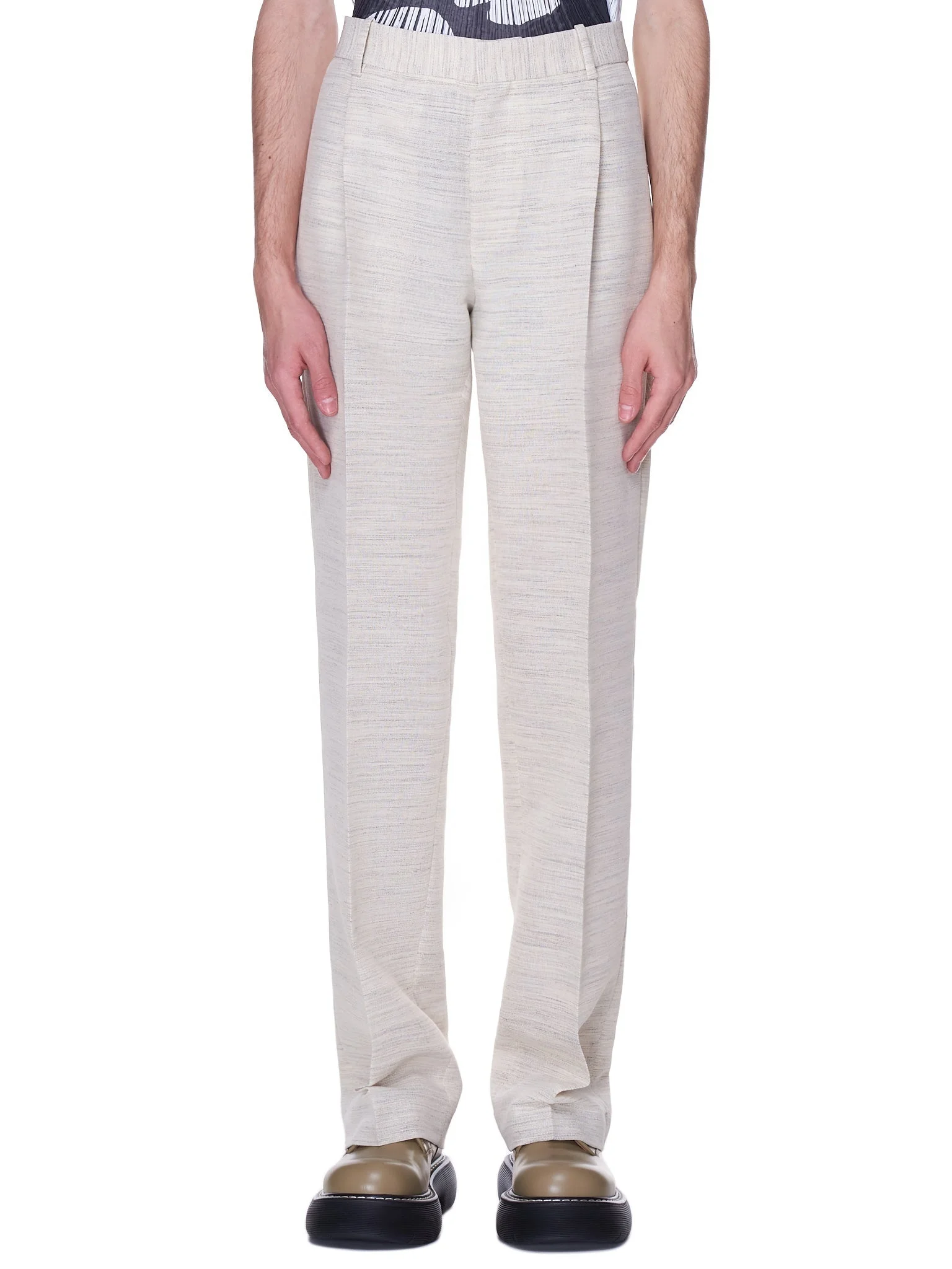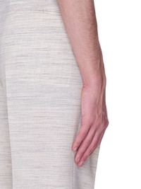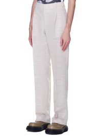 Botter pants in beige, clasp closure, belt loops, zippered fly, slash hand pockets, back welt pockets, front pleating, straight/finished hem, tonal stitching. Made in Portugal. Italian sizing. Composition - 38% Viscose, 31% Cotton, 28% Chevre, 3% Polyester Model Measurements: Model is 6ft 2” and wearing a size 46. Shoulders: 18” Chest: 31” Waist: 27”
