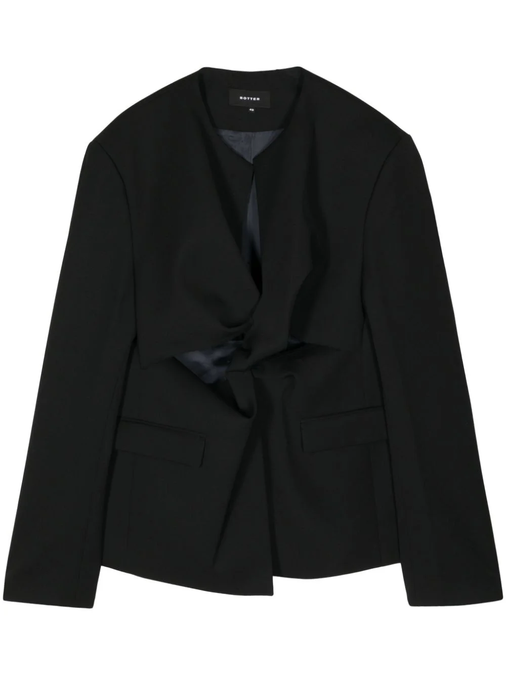 collarless virgin-wool blazer Highlights - Black - Virgin wool - Draped detailing - Collarless - Long sleeves - Buttoned cuffs - Two front flap pockets - Asymmetric hem - When buying this unisex item, keep in mind that it is graded in standard men's sizing. Imported Composition Outer: Virgin Wool 100% Lining: Viscose 100%
