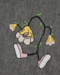 DETAILS Our chambray western button up with triple needle seam finishing and irregular chest pockets. Embroidered art by Matthew Carignan all over. Fabric sourced from Japan. Material: 100% Cotton Color: Gray