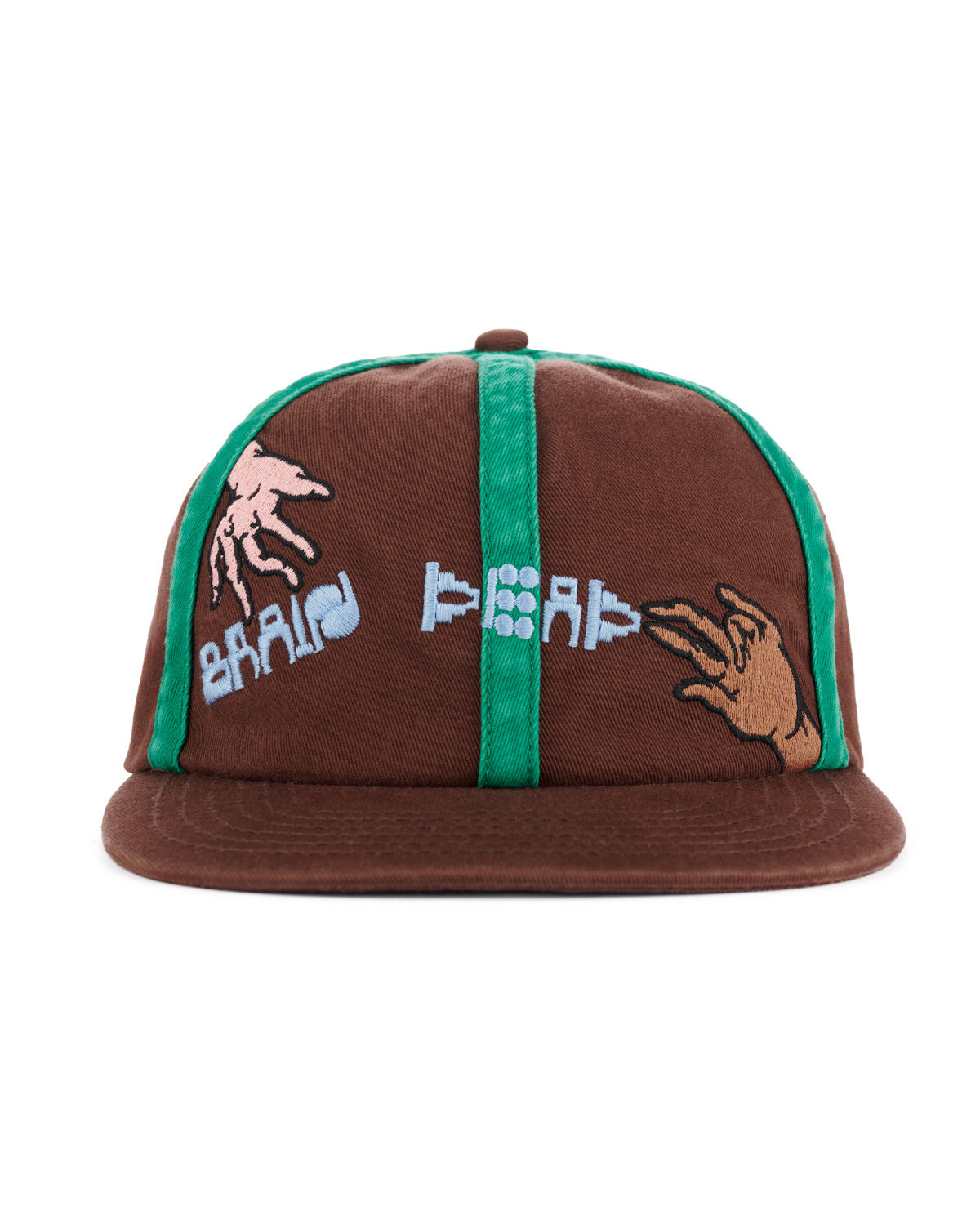 DETAILS Our signature connection 6 panel twill hat. Connection embroidery on front contrasting green piping throughout. Material: 100% cotton Color: Brown