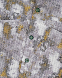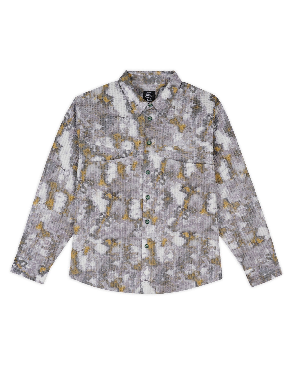 DETAILS Our cotton seersucker button up shirt with curved breast pockets. All over distorted heat print. Fabric sourced from Japan. Material: 100% Cotton Color: Grey