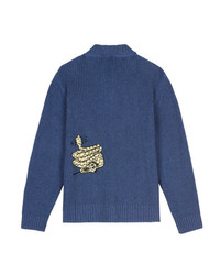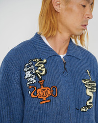 DETAILS Our zip front knit cardigan with crochet patch artwork all over. Oversized fit. Art by Tim Biskup. Material: 55% Linen / 45% Cotton Color: Blue