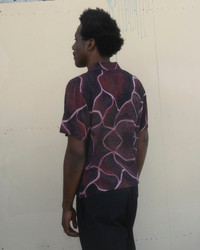 DETAILS Our short sleeve button-up shirt featuring an all-over Spiral Orb pattern, based on Elias Hernandez's original oil-on-wood artwork. Cropped, relaxed fit. <!--td {border: 1px solid #cccccc;}br {mso-data-placement:same-cell;}--> Material: 55% Viscose / 45% Rayon Color: Burgundy
