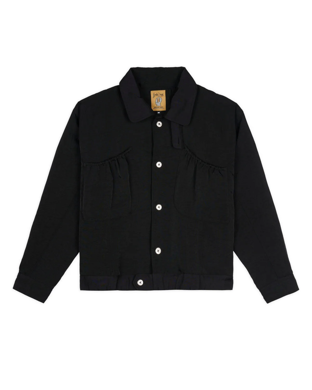 DETAILS Our cropped button up bomber jacket featuring billowed front pockets, side pockets, and a detachable collar strap. Material: 100% Nylon Color: Black