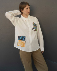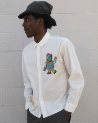 DETAILS Our seersucker long sleeve button up shirt. The fabric’s natural puckering provides comfort and airflow to keep you cool. Featuring art patches by B. Thom Stevenson and mother of pearl cateye buttons. Classic fit. <!--td {border: 1px solid #cccccc;}br {mso-data-placement:same-cell;}--> Material: 100% Cotton Color: White