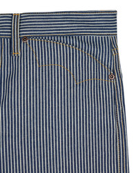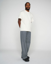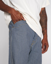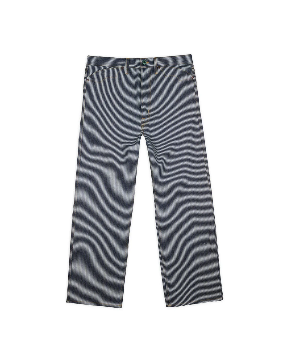 DETAILS Our wide leg hickory stripe denim, featuring front scalloped pockets, brass rivets, custom leather patch, button fly and batwing stitch details throughout. Cut and sewn in Los Angeles, CA. Note: This pant is made from raw denim - to minimize shrinking, hand wash in cold water and line dry. Material: 100% Cotton Color: Hickory Stripe