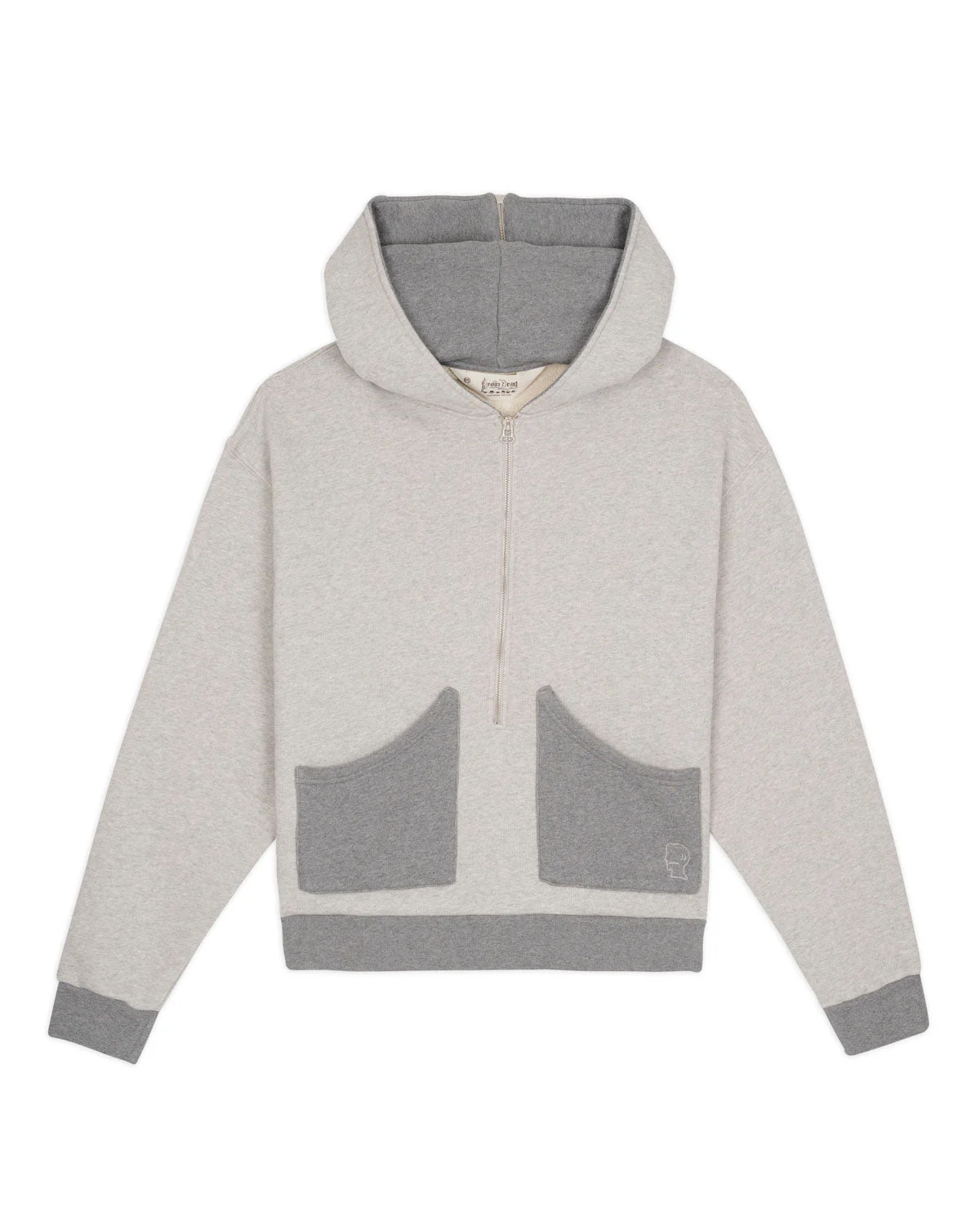 DETAILS Our two-tone french terry pullover hoodie. Features two patch pockets, half-zip on the front, full-zip through the hood, and tonal embroidered logohead detail. Made in Portugal. Material: 100% Cotton Color: Heather Grey