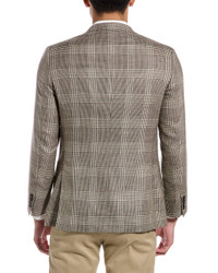 - Please note: Size selections are European. For US conversions, please reference the size chart. - Color/pattern: brown plaid - Approximately 30in from shoulder to hem - Model is 6'2.5 and is wearing a size 50. Measurements may vary slightly by size. - Design details: notch lapel, left chest pocket, two front pockets, non-functioning buttons at cuffs, four interior pockets, and side vents at hem - Two-button closure - Shell: 68% virgin wool, 18% silk, 14% linen - Lining: 100% cupro - Dry clean only - Made in Italy