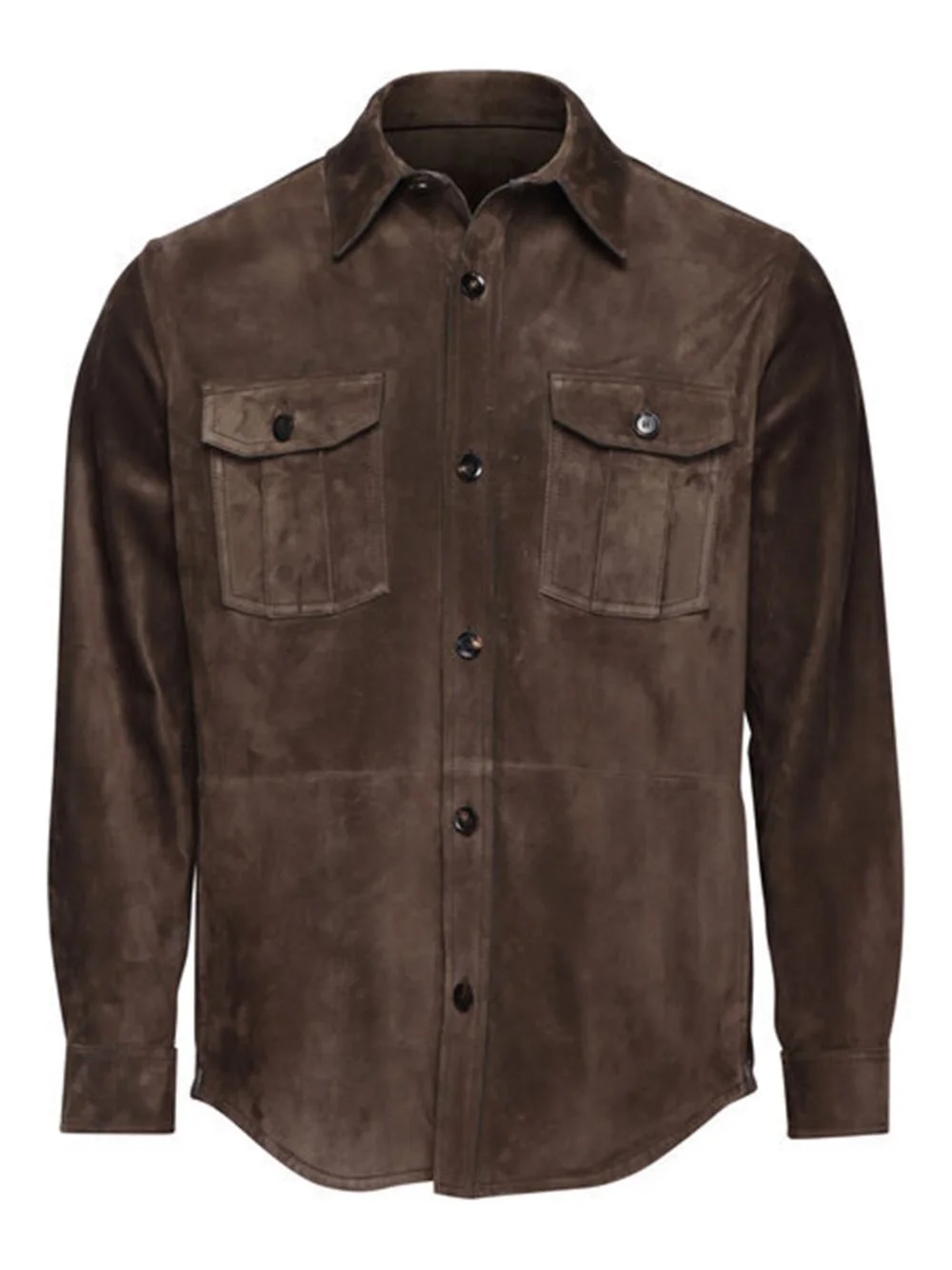 buttoned leather jacket Highlights - Brown - Suede - Flap pockets - Button fastening - Long sleeves - Buttoned cuffs - Point collar Made in United States Composition Calf Suede 100% Washing instructions Read Manufacturer Guidelines