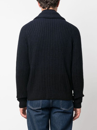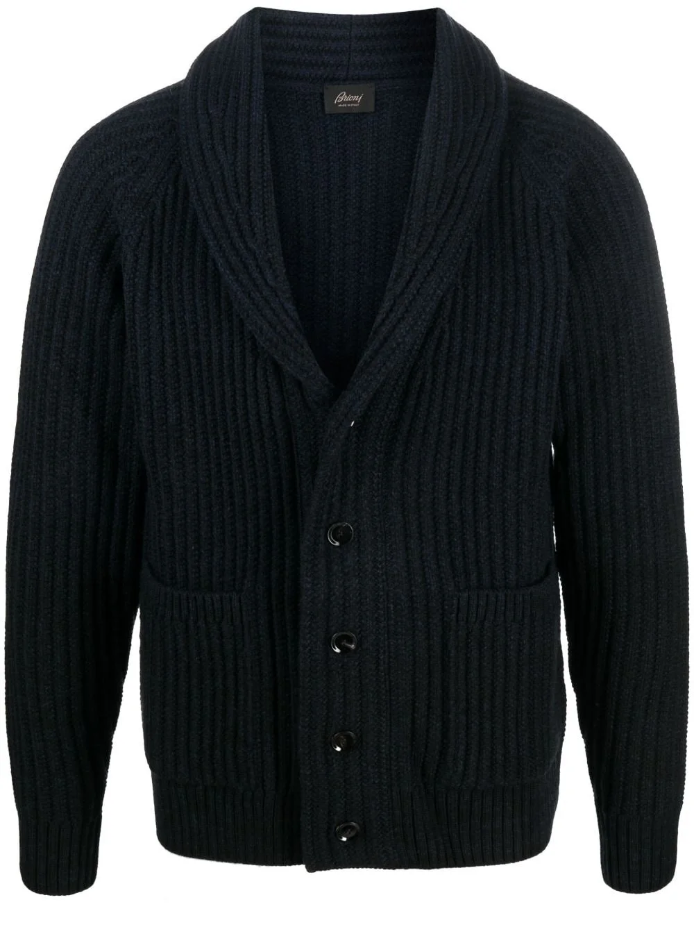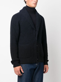 chunky-knit shawl collar cardigan Highlights - Navy blue - Virgin wool-cashmere blend - Chunky ribbed knit - Shawl lapels - Front button fastening - Extra-long sleeves - Two front patch pockets Made in Italy Composition Cashmere 50%, Virgin Wool 50% SIZE & FIT Model measurements Height 6 ft 2 in(1.89 m) Bust/Chest 38.97 in(99 cm) Hips 38.18 in(97 cm) Waist 32.28 in(82 cm) FittingInformation Designed for a slim fit, offering a comfortable fit that sits just away from the body Made with a midweight knit, this piece offers some stretch This piece fits true to size – take your usual size Washing instructions Dry Clean Only