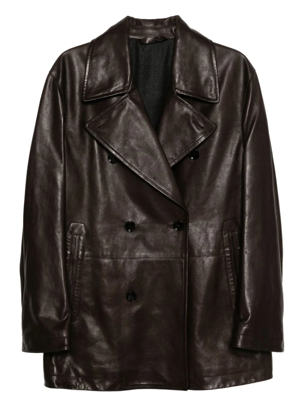 double-breasted leather jacket Highlights - Dark brown - Front button fastening - Two front welt pockets Made in Italy Composition Outer: Calf Leather 100% Lining: Wool 100% SIZE & FIT Model measurements Height 6 ft 3 in(1.9 m) Bust/Chest 35.03 in(89 cm) Hips 36.61 in(93 cm) Waist 29.13 in(74 cm) FittingInformation Designed for a regular fit, allowing for a comfortably loose fit throughout the body Firm leather offering little flexibility to maintain its durability and sturdiness Washing instructions Specialist Cleaning