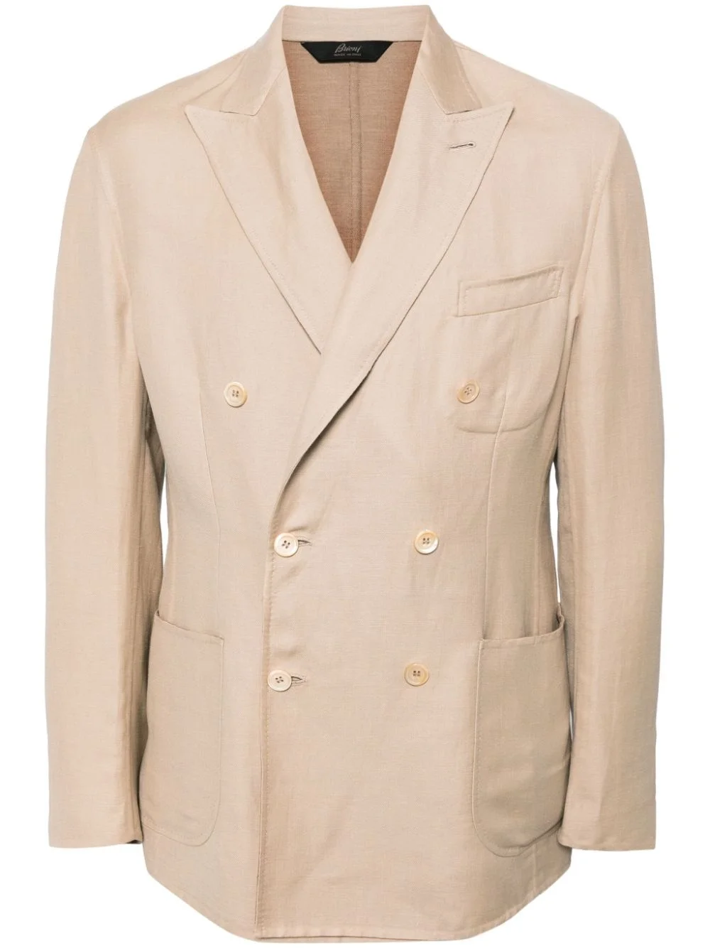 double-breasted linen-blend blazer Highlights - Light beige - Linen-wool-silk blend - Slub texture - Dart detailing - Peak lapels - Double-breasted button fastening - Long sleeves - Buttoned cuffs - Chest welt pocket - Two front patch pockets - Internal patch pocket - English rear vents - Straight hem - Full lining Made in Italy Composition Outer: Linen/Flax 50%, Wool 44%, Silk 6% Lining: Cupro 100% SIZE & FIT Model measurements Height 6 ft 2 in(1.87 m) Bust/Chest 33.07 in(84 cm) Hips 35.43 in(90 cm) Waist 26.77 in(68 cm) FittingInformation Designed for a relaxed fit, this piece allows for comfort and movement when worn The vented hem offers movement at the rear Made from a midweight non-stretch fabric This piece fits true to size – take your usual size