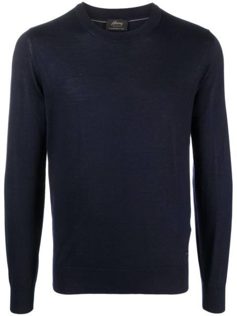 fine-knit silk-cashmere jumper blue cashmere-silk blend fine knit crew neck long sleeves ribbed cuffs ribbed hem Made in Italy Composition Outer: Cashmere 70%, Silk 30% SIZE & FIT Model measurements Height 6 ft 2 in(1.87 m) Bust/Chest 34.25 in(87 cm) Hips 36.22 in(92 cm) Waist 29.52 in(75 cm) FittingInformation This piece fits true to size. We recommend you get your regular size Cut for a loose fit Made with a mid-weight fabric Washing instructions Dry Clean Only