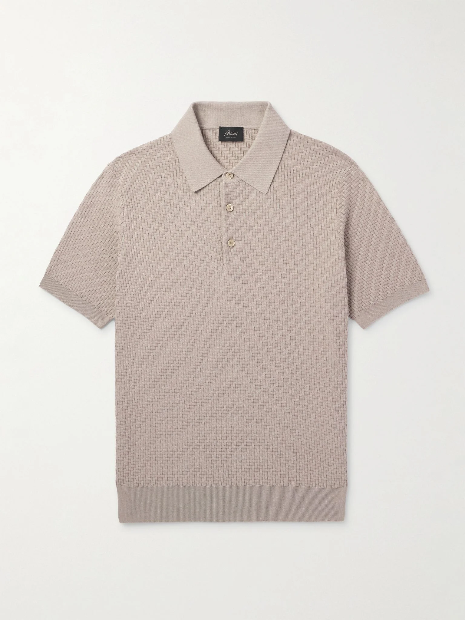 Brioni's meticulous approach to style dates back to 1945. This polo shirt is knitted from cotton and silk threads blended with a little cashmere for extra softness. The cross-hatch stitch brings an element of texture and dimension. Size & Fit - Fits true to size. Take your normal size - Designed for a regular fit - Lightweight knit - Model is shown wearing an IT 48 - Model measures: chest 38"/ 96cm, height 6'2"/ 188cm Details & Care - Beige cotton, silk and cashmere-blend - Button fastenings - 57% cotton, 34% silk, 9% cashmere - Dry clean - Mother-of-pearl: Australia