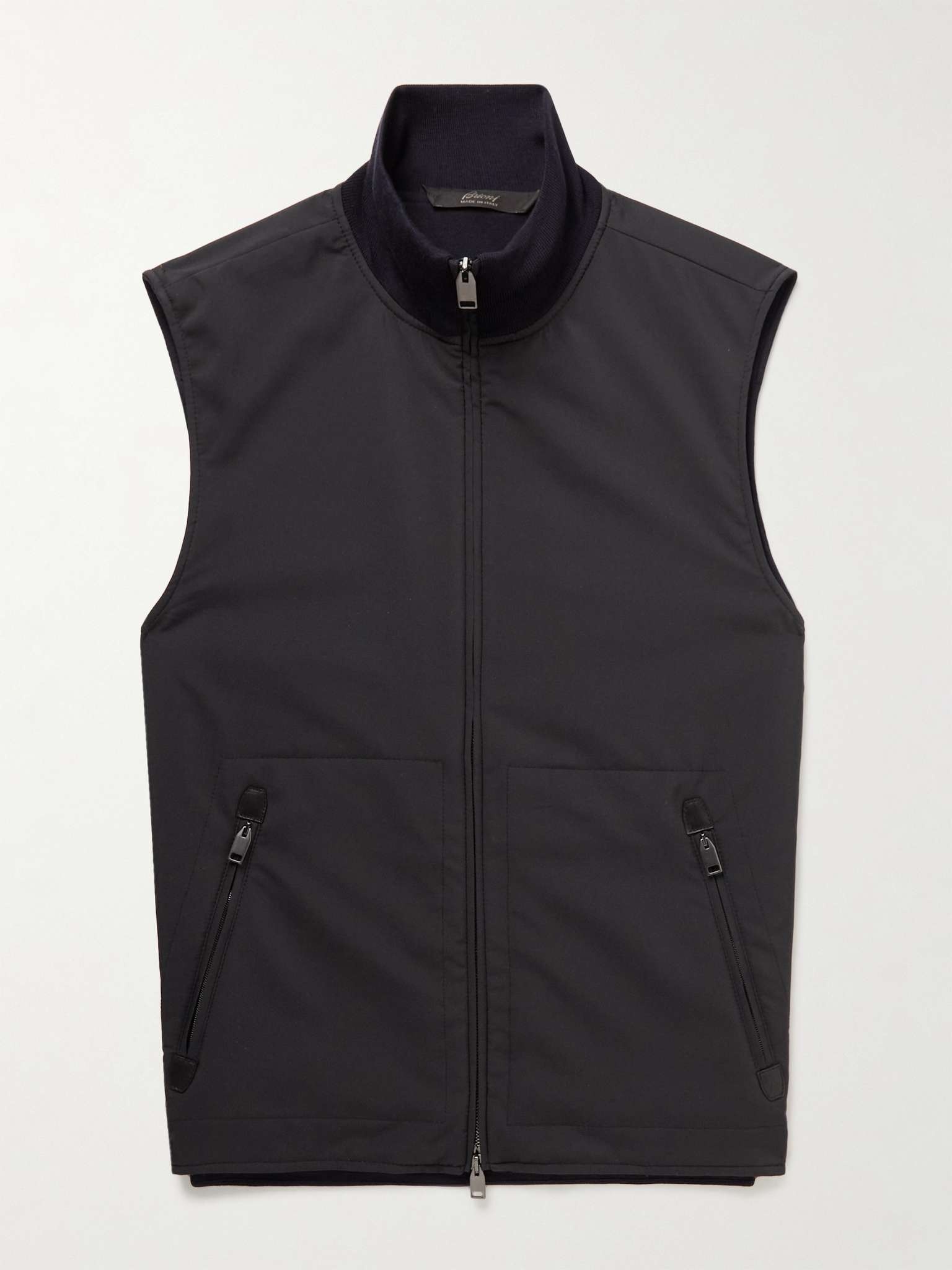 - Black shell, navy wool - Funnel neck, front zipped slash pockets, leather and ribbed trims - Two-way zip fastening - Fabric1: 100% polyester; fabric2: 100% wool; trim: 100% leather (Lamb) - Dry clean