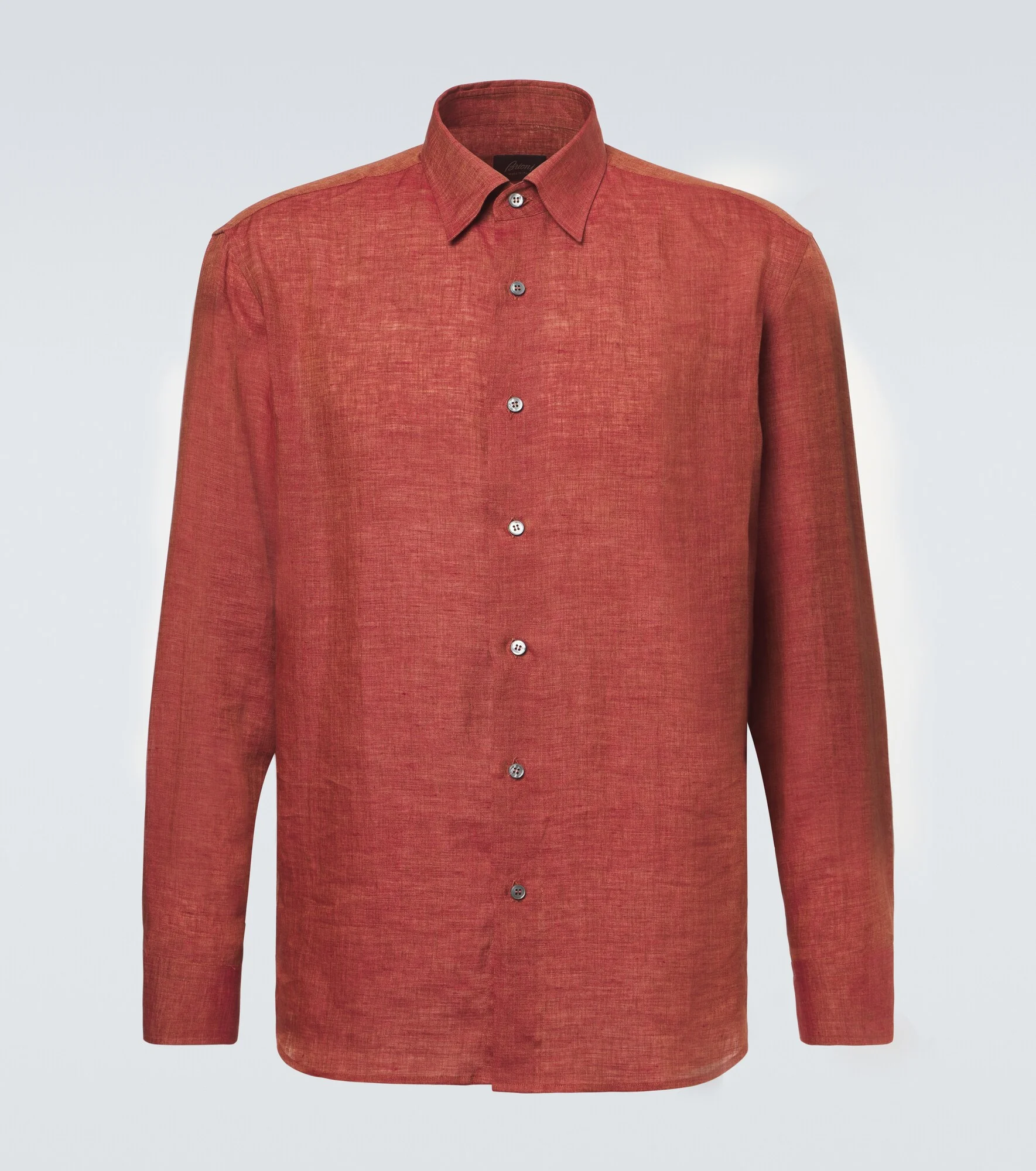 Exude timeless sophistication with this shirt from Brioni. The design is crafted in Italy from pure linen and features a classic straight-collar silhouette. Product Details - Material: 100% linen - Care instructions: machine wash at 30 degrees - Made in Italy - Color: orange - Designer color name: Sienna - Contains non-textile parts of animal origin - Closure: buttoned placket - Collar: classic (Straight point) - Cuff: two buttons - Item number: P01139077 Size & Fit - True to size - Without pleats in the back - Classic fit - Non-stretchy fabric - Falls below the hip - Height of model is 189cm-74.5" and wears a size L