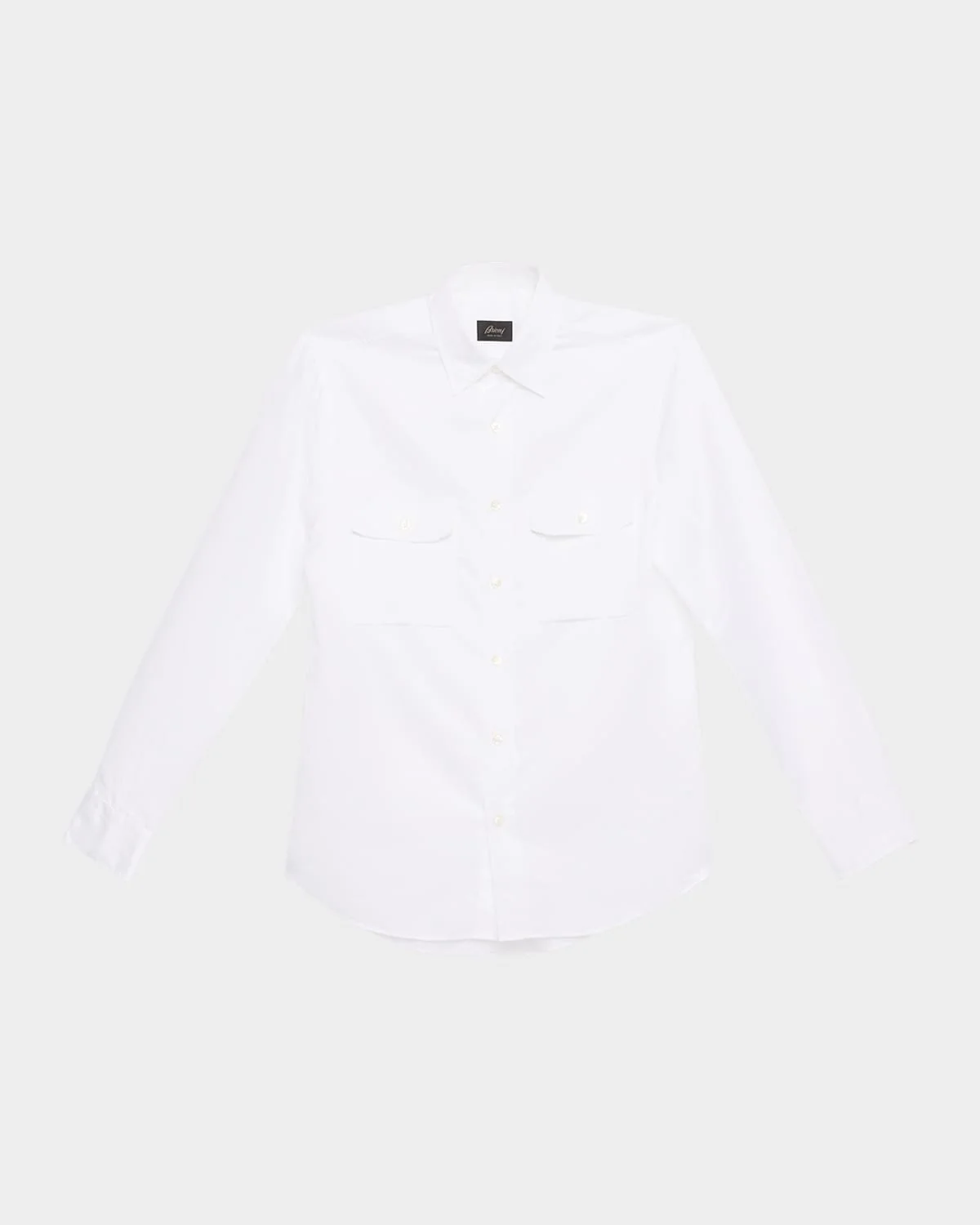 Brioni & apos;s military shirt is crafted of a lightweight cotton and linen blend, offering a natural texture. Spread collar Button placket Chest flap pockets Buttoned cuffs Curved hem Cotton/linen Dry clean Made in Italy