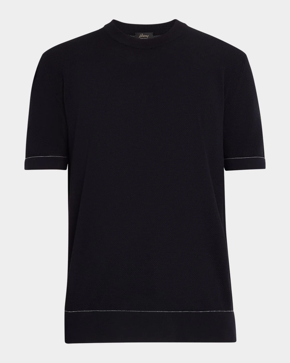 Brioni T-shirt sweater in luxurious Sea Island cotton with contrasting hairline stripe trim Crew neckline Short sleeves Ribbed cuffs and hem Pullover style Cotton Dry clean Made in Italy
